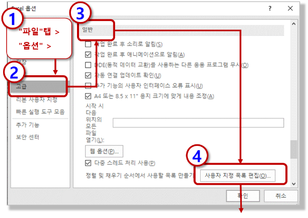 - 메뉴 패스 (리본 메뉴) : "파일" 탭 > "옵션" > "고급" > "일반" > "사용자 지정 목록 편집"