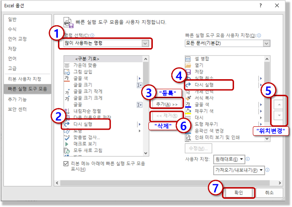 3) 빠른 실행 도구 모음 사용자 지정 (메뉴) : 등록/삭제/이동 하기